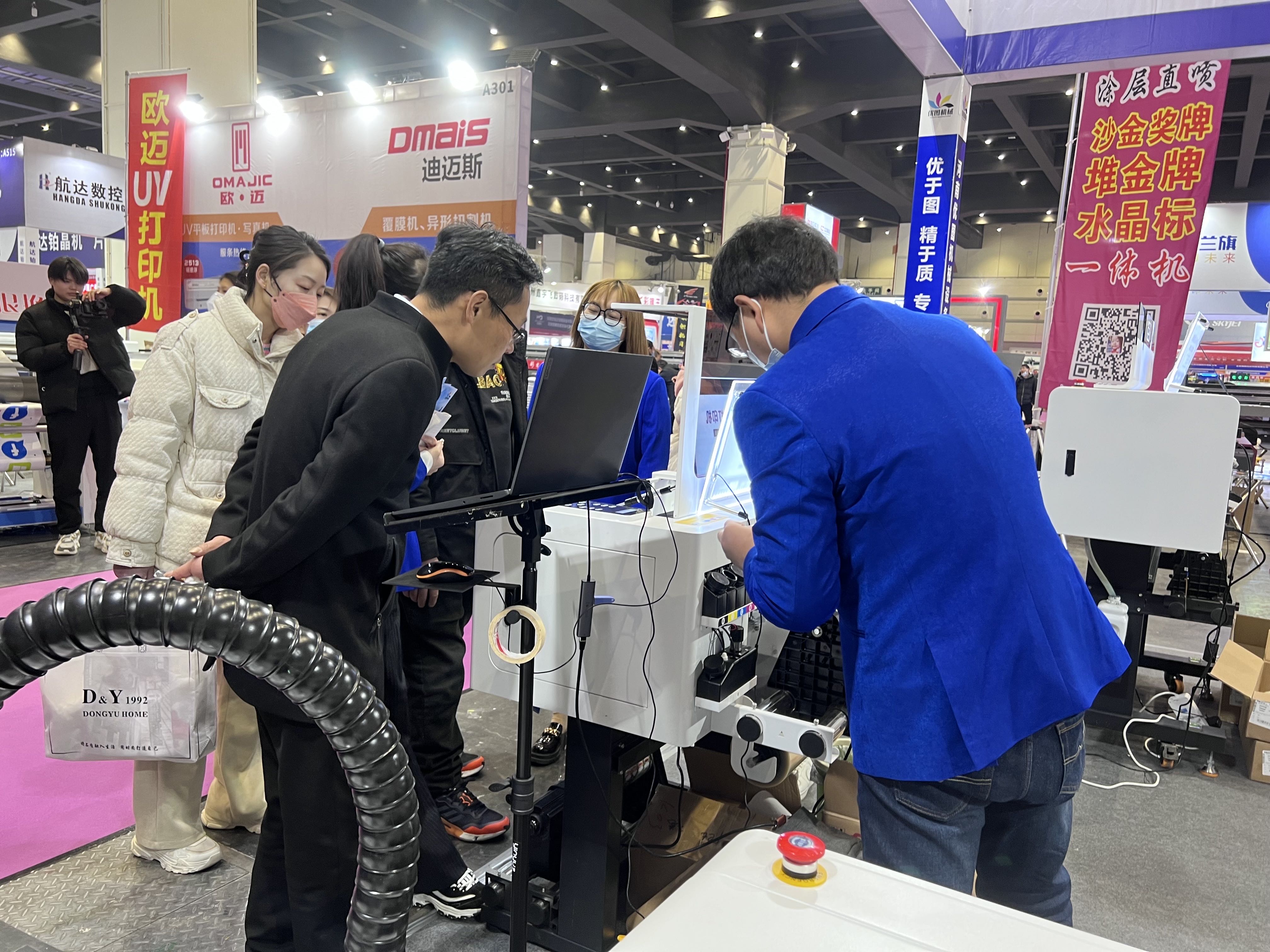 观众现场观看30cm及60cm规格的白墨烫画的工作状态,机器操作简单快捷,打印出的图案柔软有弹性,而Uv水晶标打印机无需制版,即打即干,图案精度高,还具有很好的防滑耐磨性,如此直观的展示方式使客户对产品了解更深入透彻,也吸引了无数围观和惊叹!
